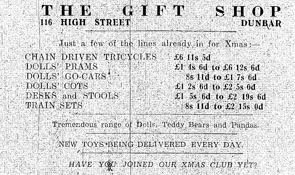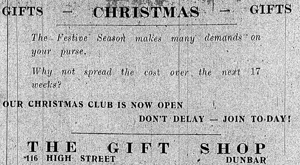 This appeal (in the photo above) to women shoppers in Dunbar – demands on your purse – was a common feature of shops like the Gift Shop or the Co-Op in the 1950s, with the advert encouraging saving over 17 weeks before Xmas. The festive season was a boom time for The Gift Shop as people bought a variety of gifts including (see below) children’s Xmas presents. Supermarkets today still have Xmas clubs in which shoppers can invest, although this site states Many supermarkets urge you to save for bonuses in their savings schemes year-round – though as the money’s not protected should the scheme go bust, this isn’t recommended. Yet for many schemes, you can bag the rewards by just putting your money in them for a day.