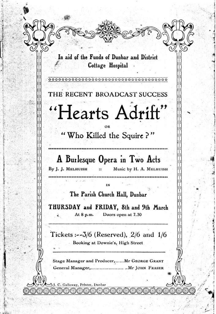 DDHS Secretary Pauline Smeed told a good -sized AGM audience that among the many projects supported by the society this year was the renovation and re-opening of Dunbar Parish Church Hall. To support a display in the hall, DDHS donated items of past events in the hall, together with copies of the original plans of the hall from 1908, The photo above shows an advert for a concert in the hall in aid of Dunbar Cottage Hospital. you can read more about and see photos of the renovations here.