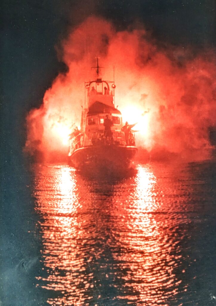 Dr James Herring led the presentations and showed attendees photos from the 1999 Millenium celebrations at Dunbar Harbour. The photo above shows the Dunbar Lifeboat with cox Noel Wight at the helm and 15 year old Andrew Chisholm playing the pipes at the front of the lifeboat. It was a spectacular entrance to the harbour, with the lifeboat lit up with flares and it reminded many people of Up Helly Aa (good photos) in Shetland, where a replica Viking ship is set alight. There was a huge crowd of people at the harbour on Auld Year’s Night 1999 to see an archer fire a flaming arow to light the beacon on the castle top and then to cheer wildly as the lifeboat appeared, at first just a blaze of light and then as an illuminated vessel.