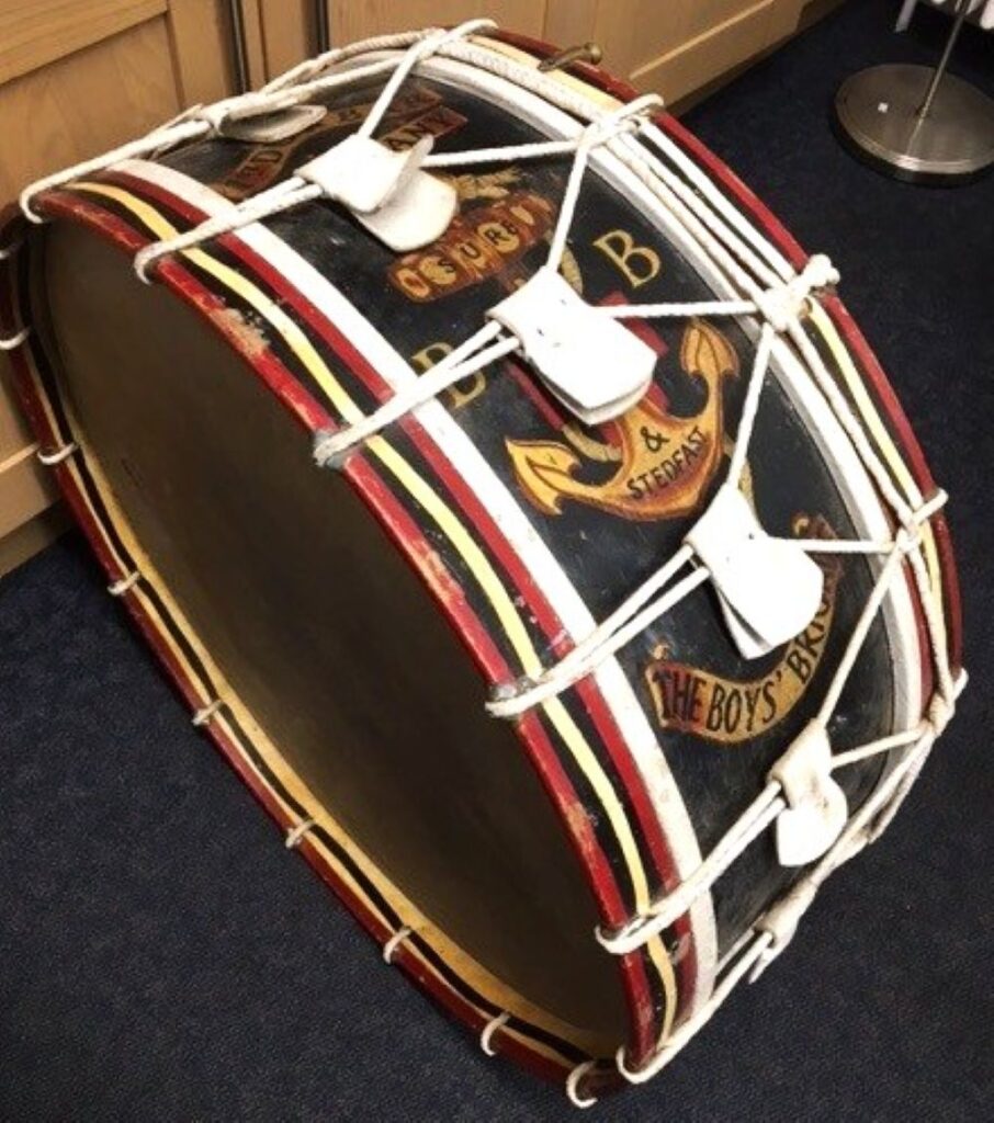 Chair Gordon Easingwood then showed the photo above, which is a Boys Brigade drum found under the hall stage during the renovation. The drum was a reverse donation i.e. given to DDHS by the hall committee and it was passed on to the Museum and Archives in the John Gray Centre. You can see a photo of the Dunbar BB corps in the 1960s here.